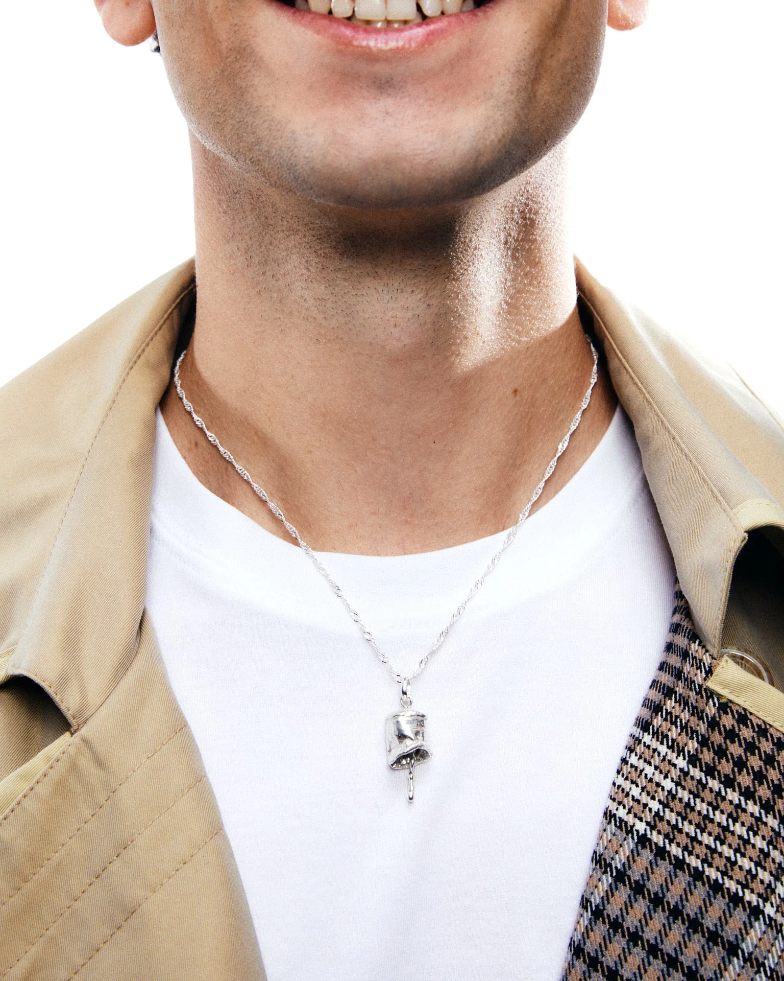 Un colgante de plata que toma la forma de un cencerro antiguo, con un pequeño péndulo interior que aporta movimiento. Inspirado en los amuletos que, en distintas culturas, protegían a los recién nacidos y acompañaban los primeros pasos de la vida.